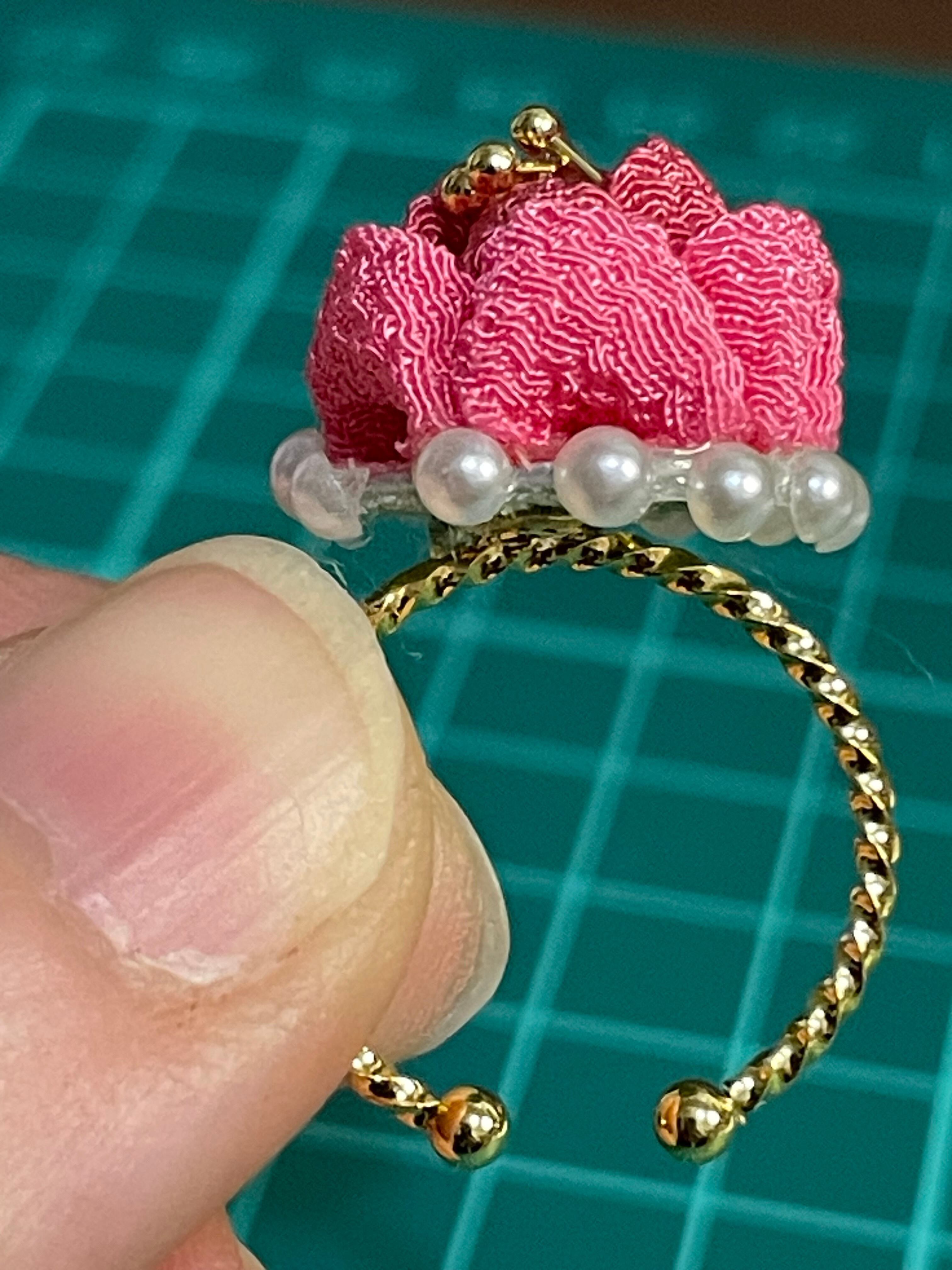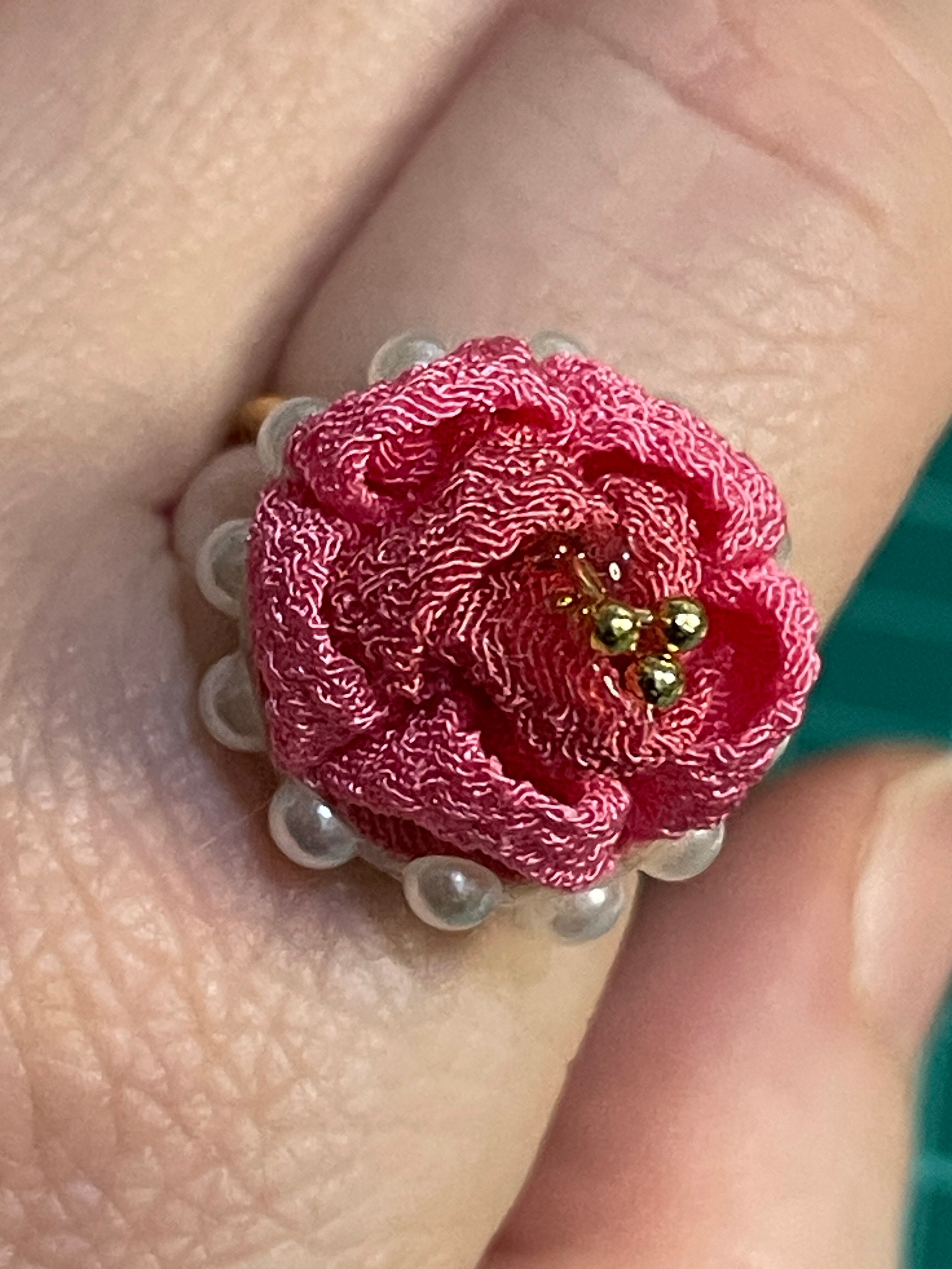 ・カラーは情熱的な赤で、サイズは約2.5cmの花のモチーフが指元で存在感を放ちます。サイズはフリーサイズとして調整可能ですので、どなたでもお楽しみいただけます。