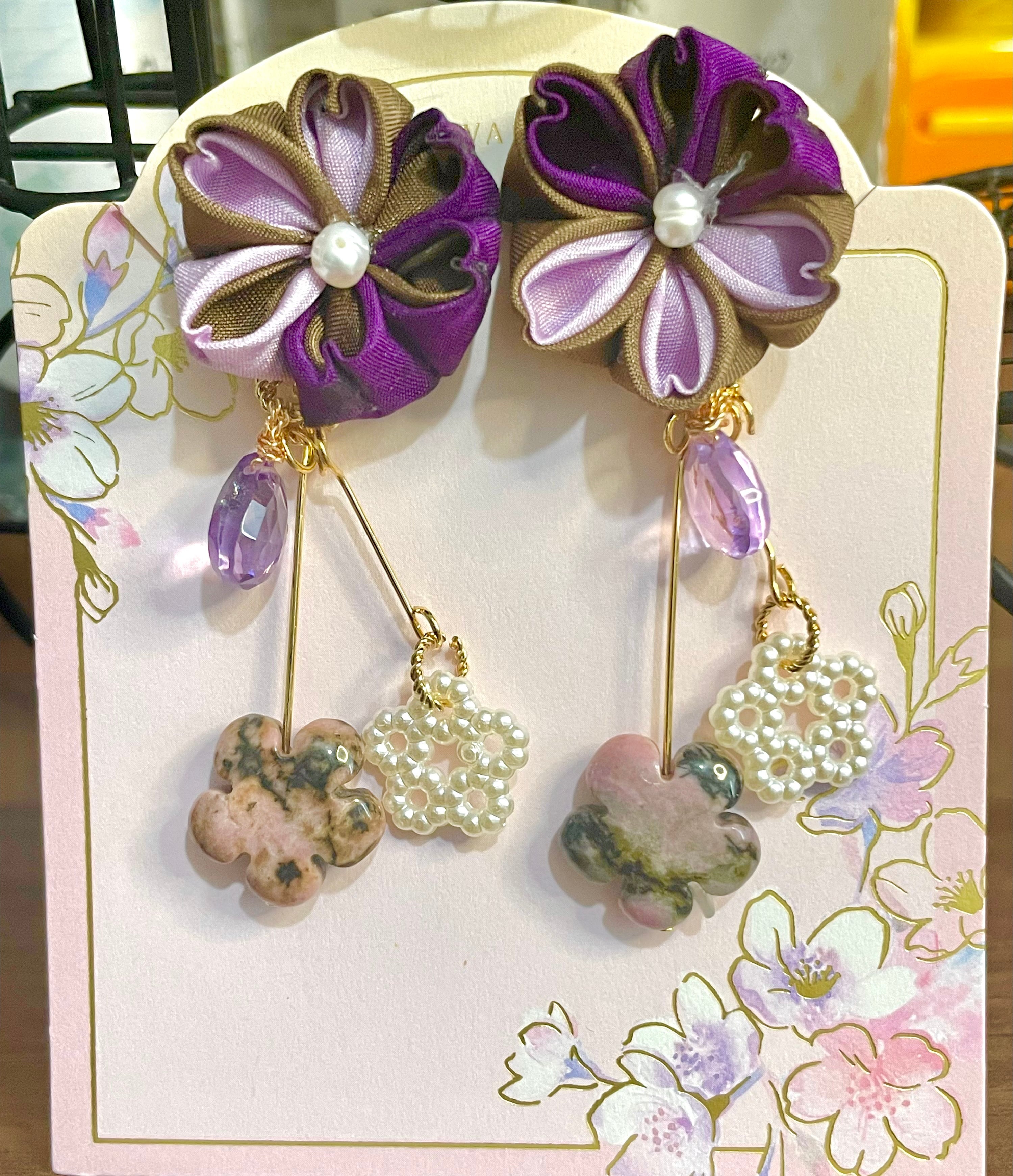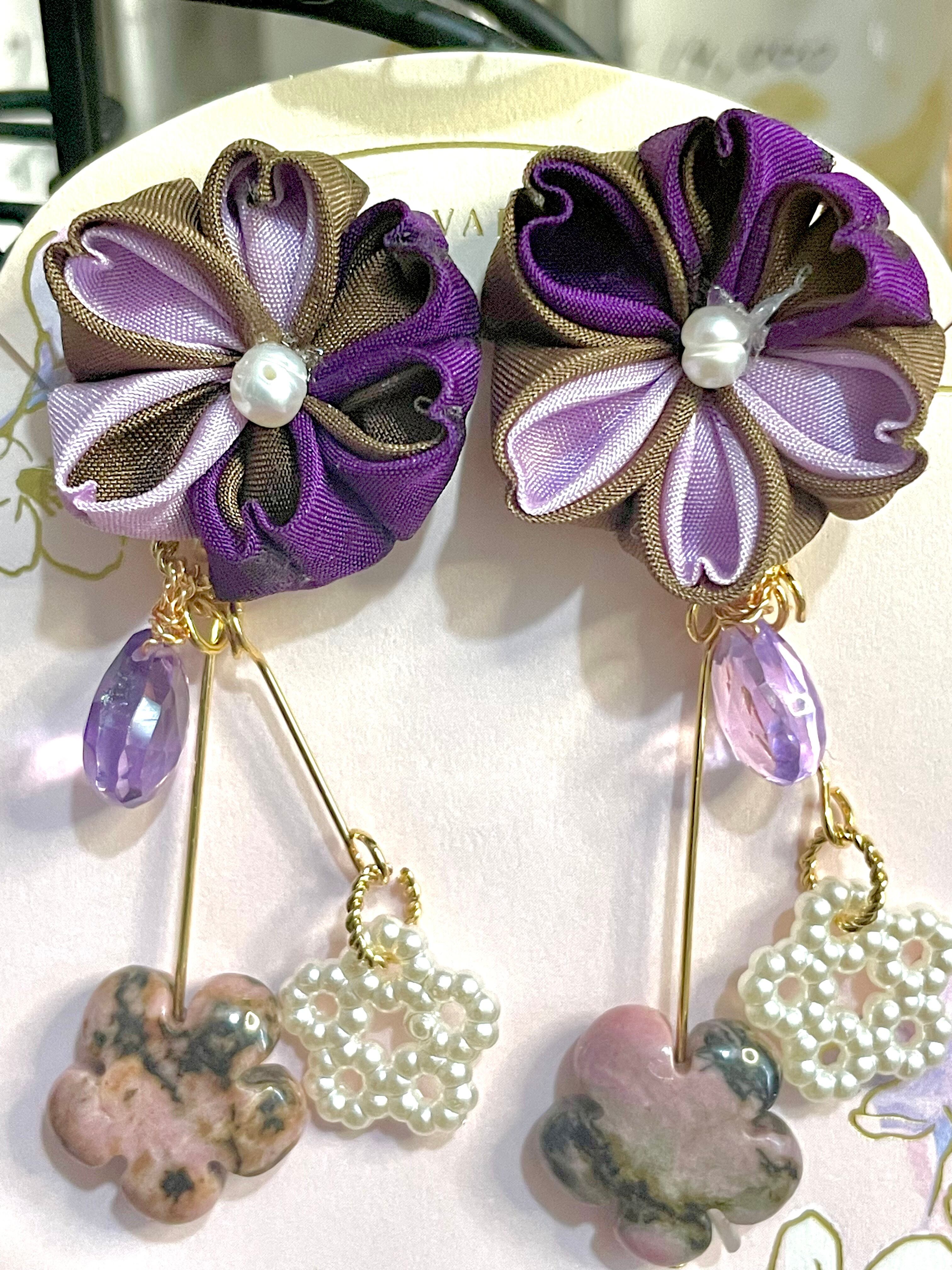 お花の材質はシルクを使用二重摘みの技法で桜を仕上げました。アメジストなど、落ち着いた色目ではありますが天然石を使いゴージャスに仕上げました