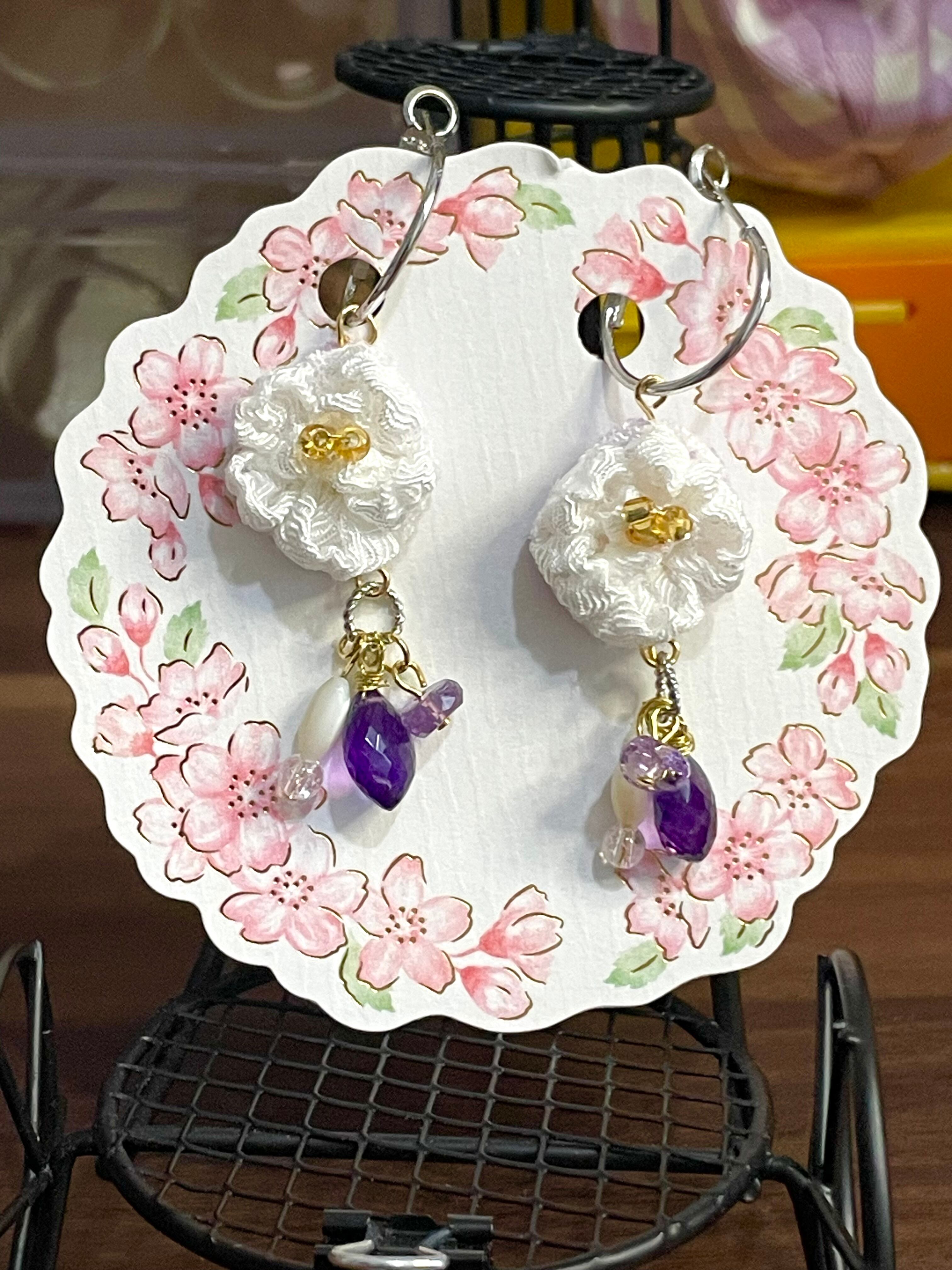 ・カラーは清楚な白桜と深みのあるアメジスト、サイズは約3cmのデザインが耳元で華やかに演出します。細やかな手作業による独自のテクスチャーが、視覚的な魅力を引き立てています。