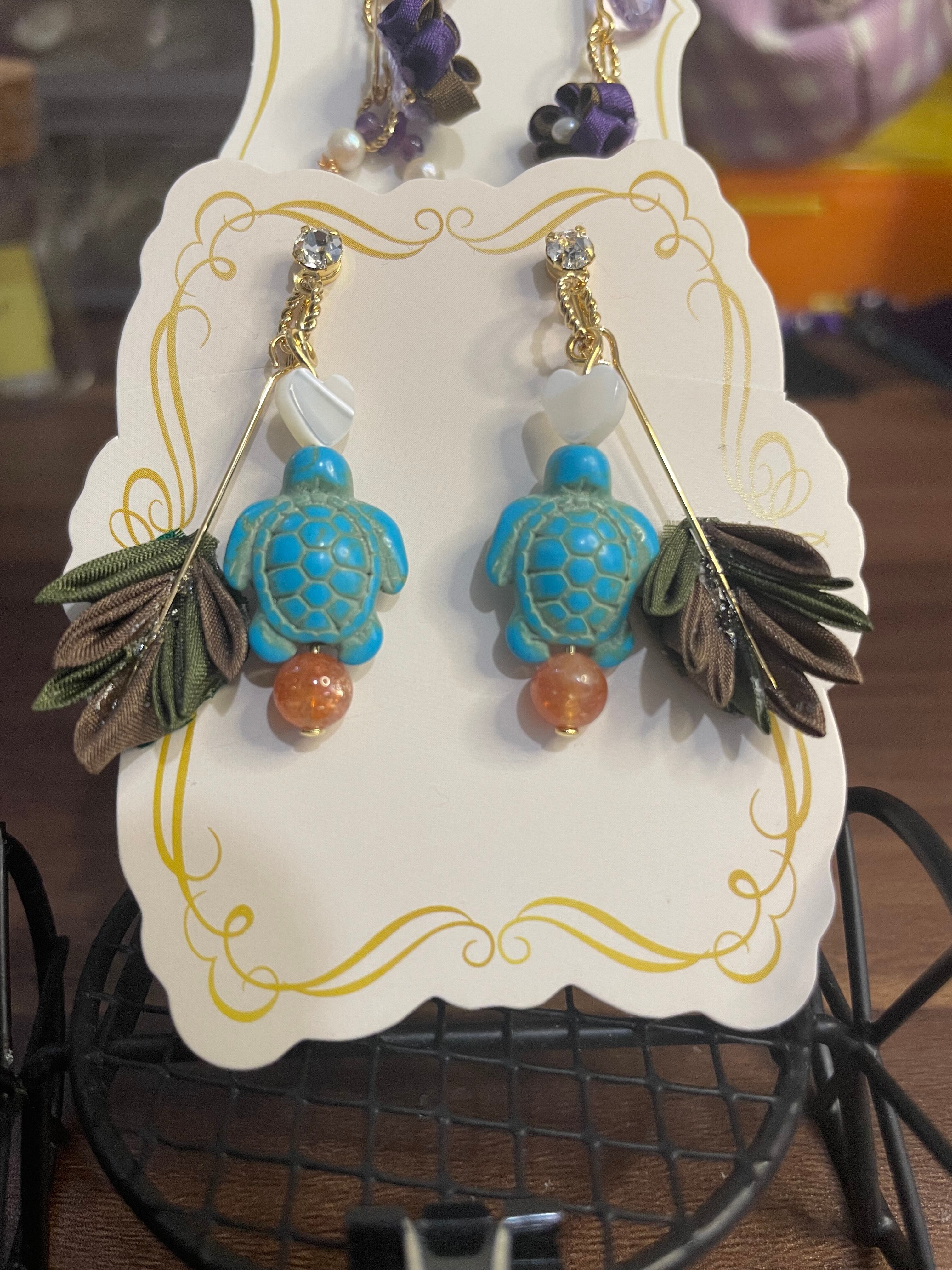 特徴は、愛らしいカメモチーフに輝くサンストーンとシェル、そしてシルクの葉が見事に調和し、耳元に自然の美しさを加えます。特にサンストーンの温かみのある輝きは、あなたのスタイルに優雅なアクセントを与え、どんな場面でも注目を集めることでしょう。一つ一つ丁寧に手作りされており、軽やかな着け心地で、存在感を感じつつもストレスなくご利用いただけます!