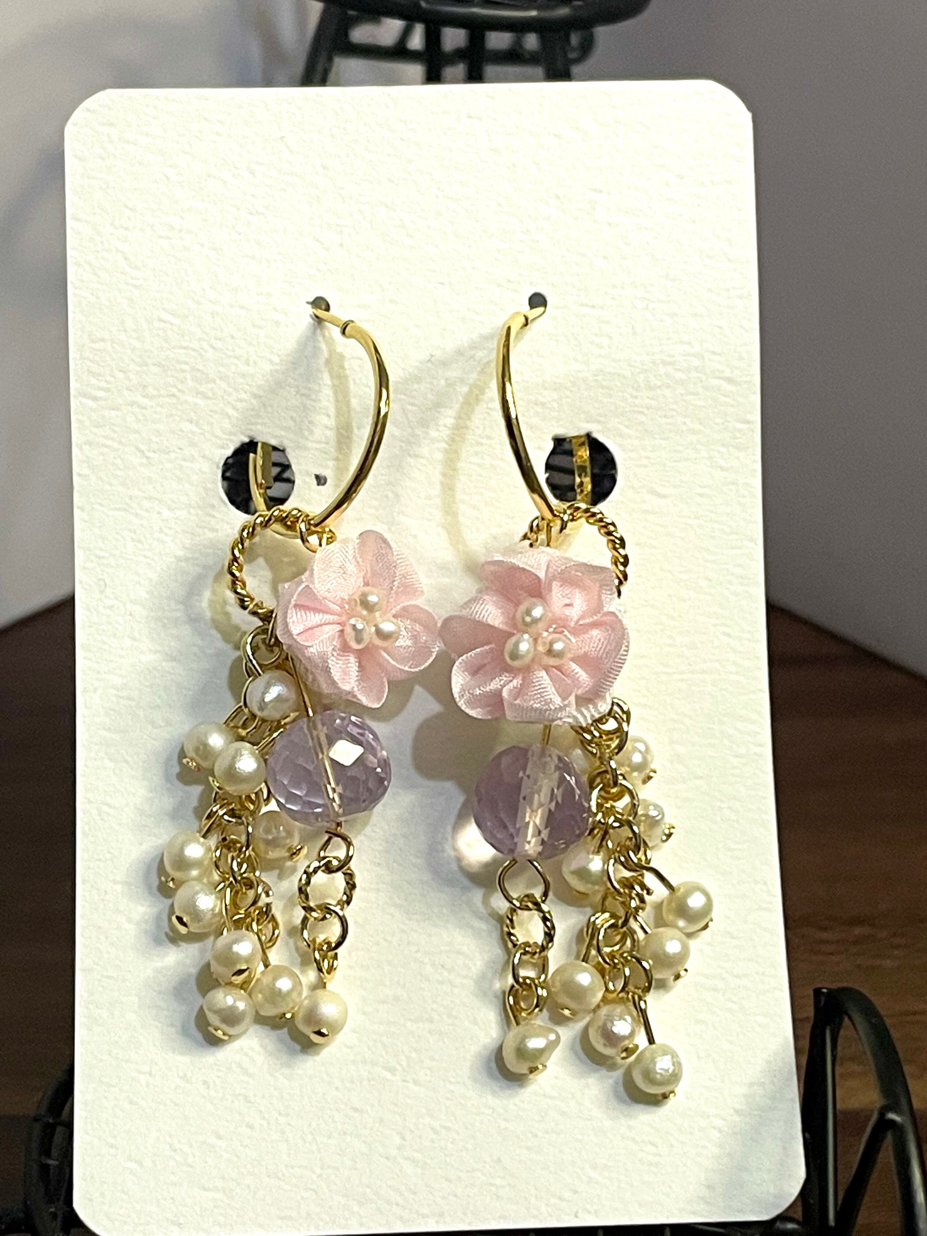 ・カラーは淡い桜色と、淡水パールの上品な光沢、ピンクアメシストの柔らかな輝きが美しく調和し、耳元を華やかに演出します。サイズは約4cmで、手作業による繊細な仕上げが視覚的な魅力をさらに引き立てています。