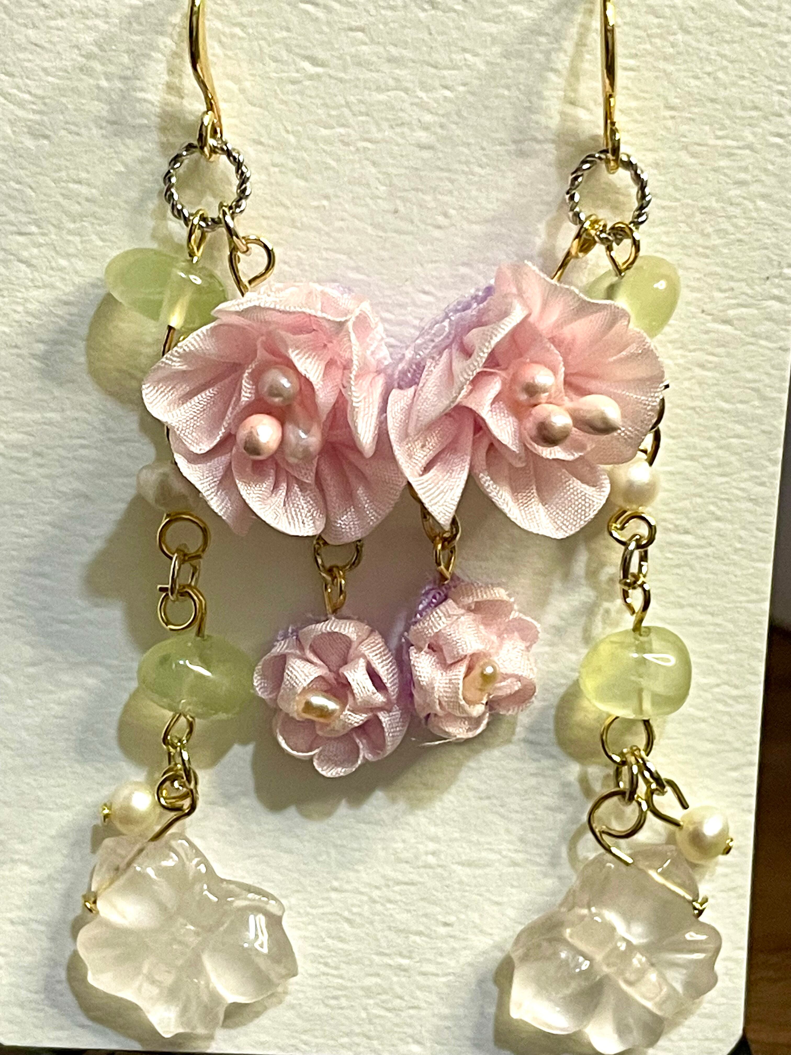 特徴は、シルクの桜とローズクォーツの蝶、さらにはプレナイトが見事に組み合わさり、あなたの耳元に優雅さと華やかさをもたらします。柔らかなシルクの質感と繊細なデザインが調和し、特別な日常やイベントで周囲の視線を惹きつけることでしょう。一つ一つ丁寧に手作りされており、軽やかな着け心地を実現しています!