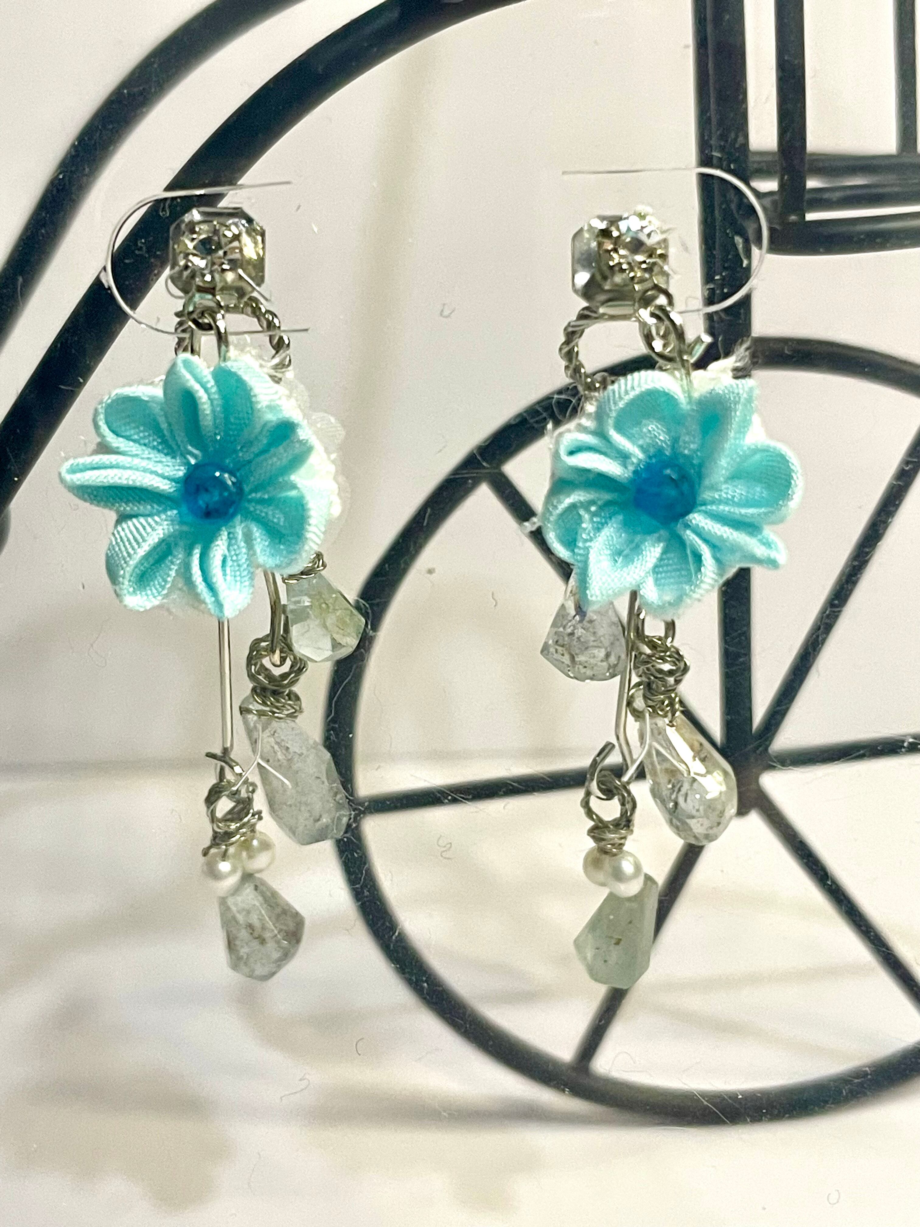 小さなお花はシルクを使用し、花芯はネオンブルーのアパタイト。
