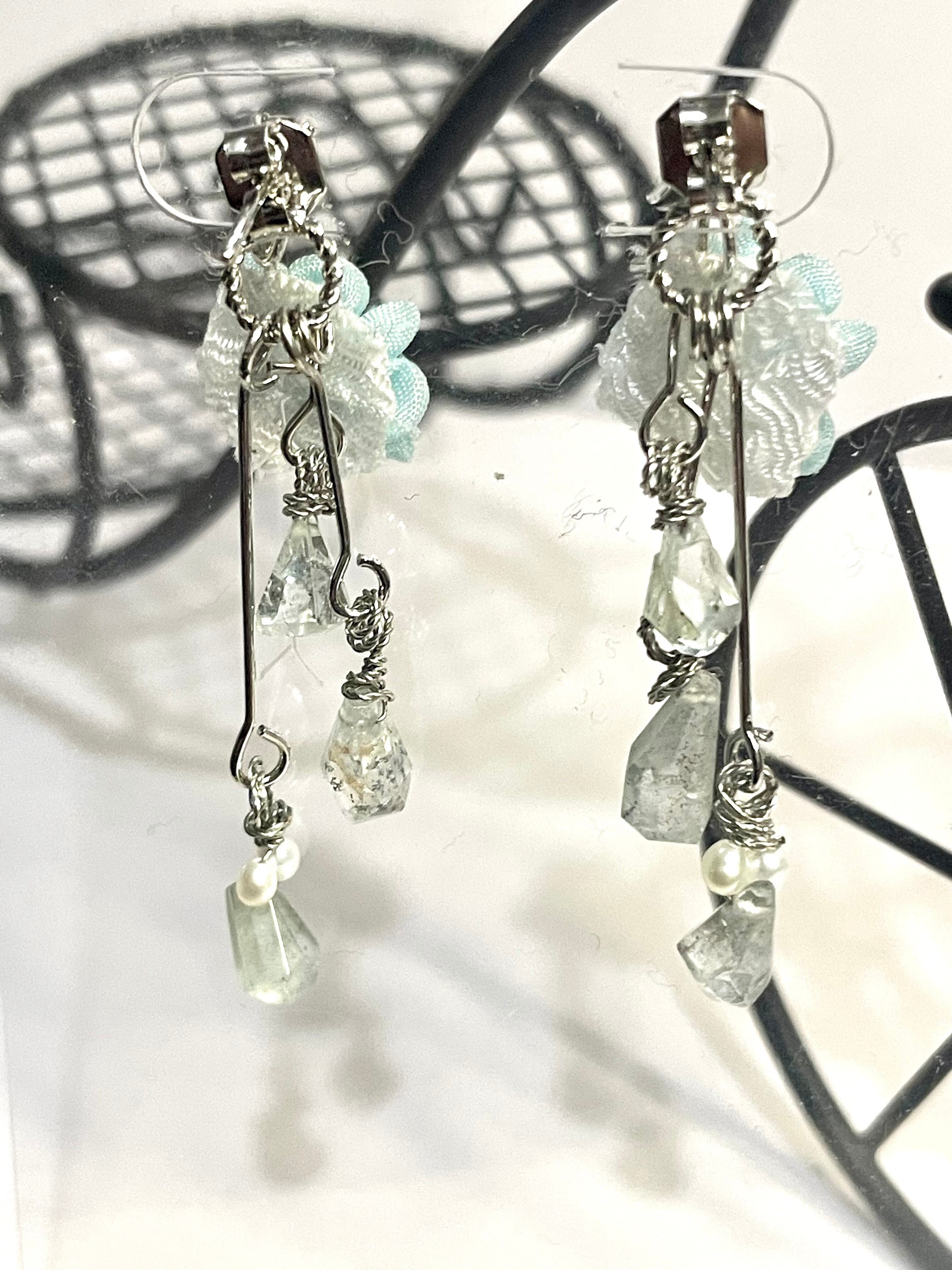 キャッチ部にアクアマリンを6石、一番下のアクアマリンに淡水パールを付けました。