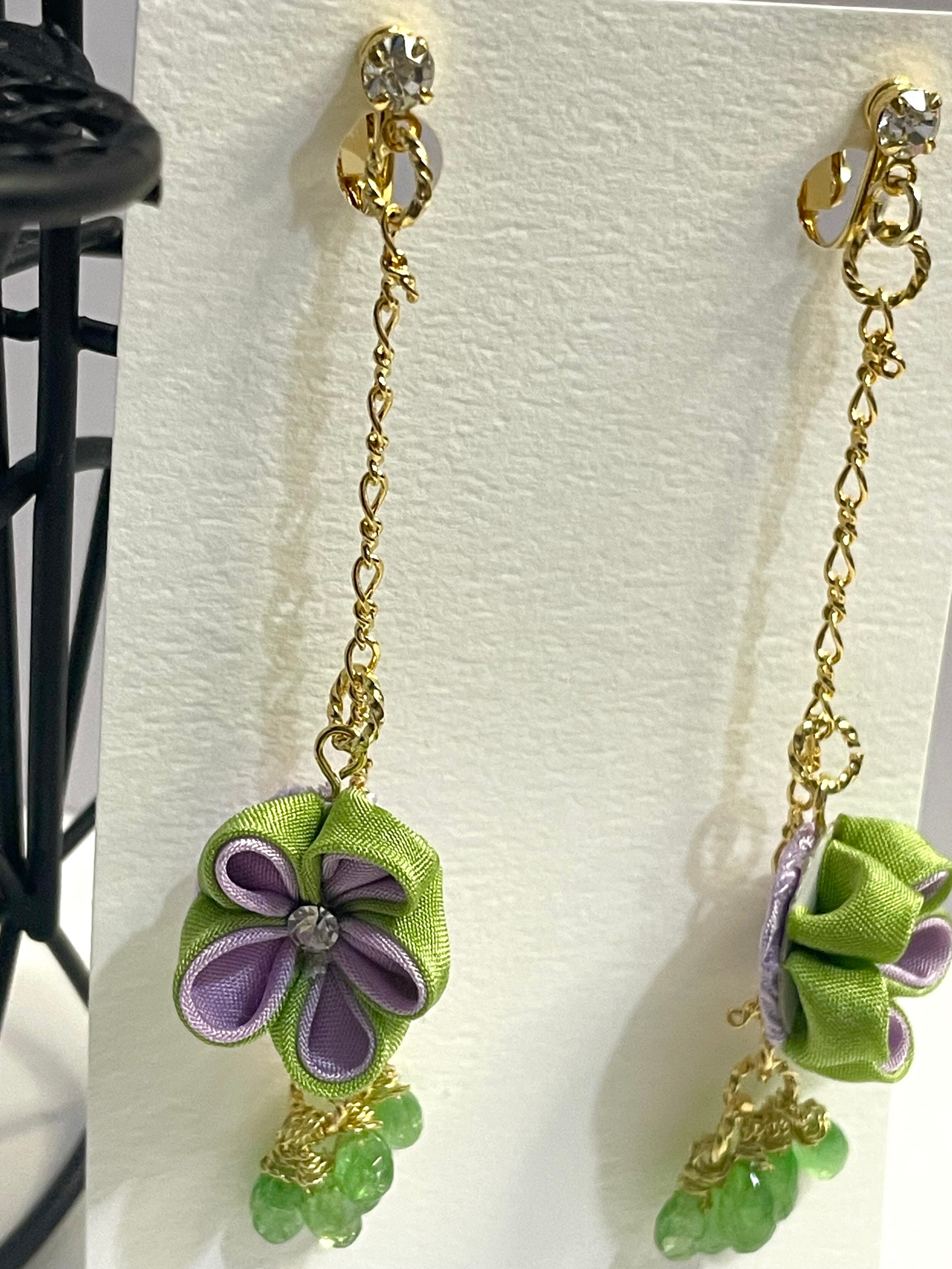 お花はシルク素材、多色を一気に摘む技法です。今回は内が紫、外を緑にしました。