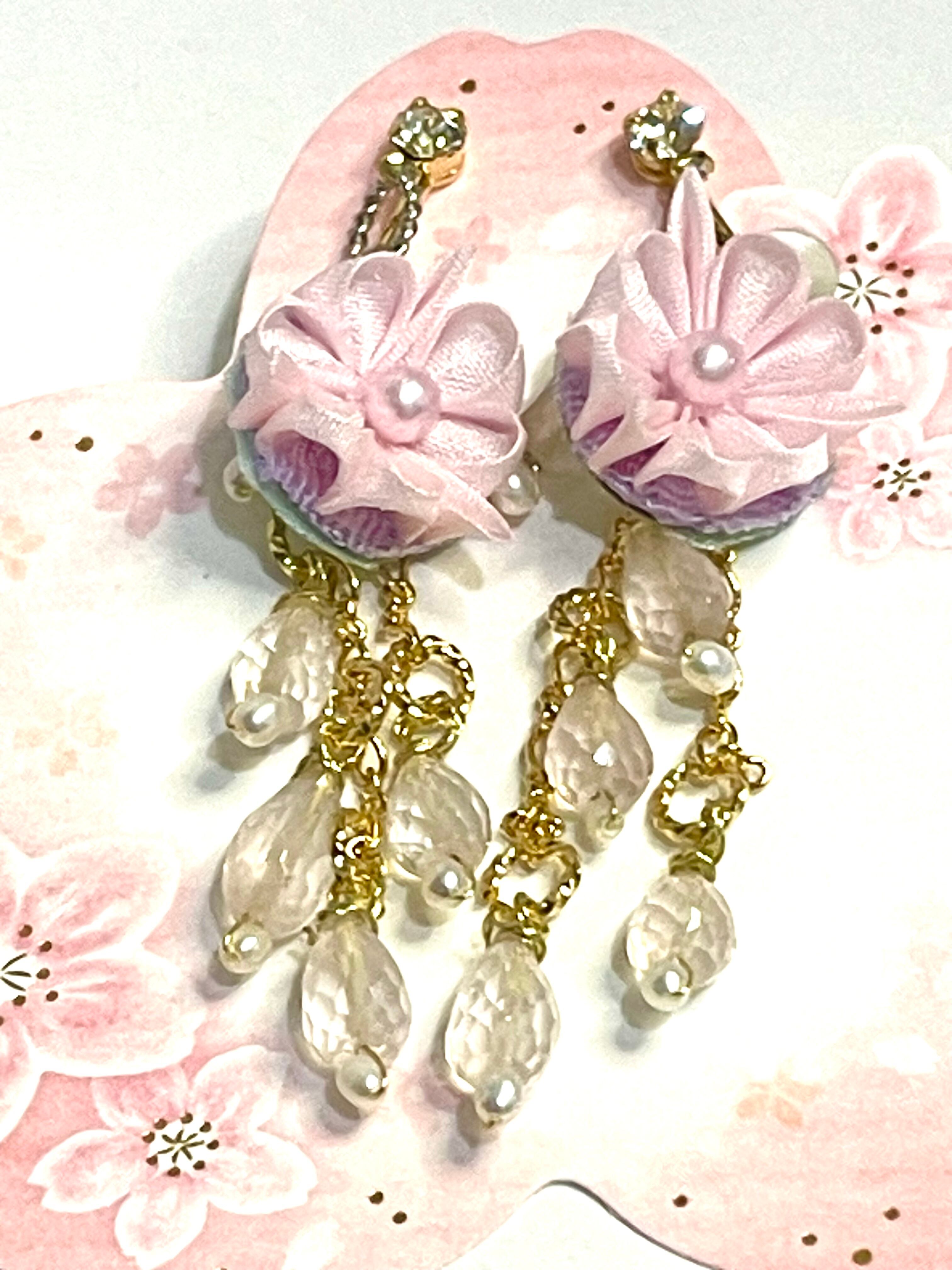 花は10匁シルク、石はローズクォーツた淡水パールを使用、まだまだ桜は季節