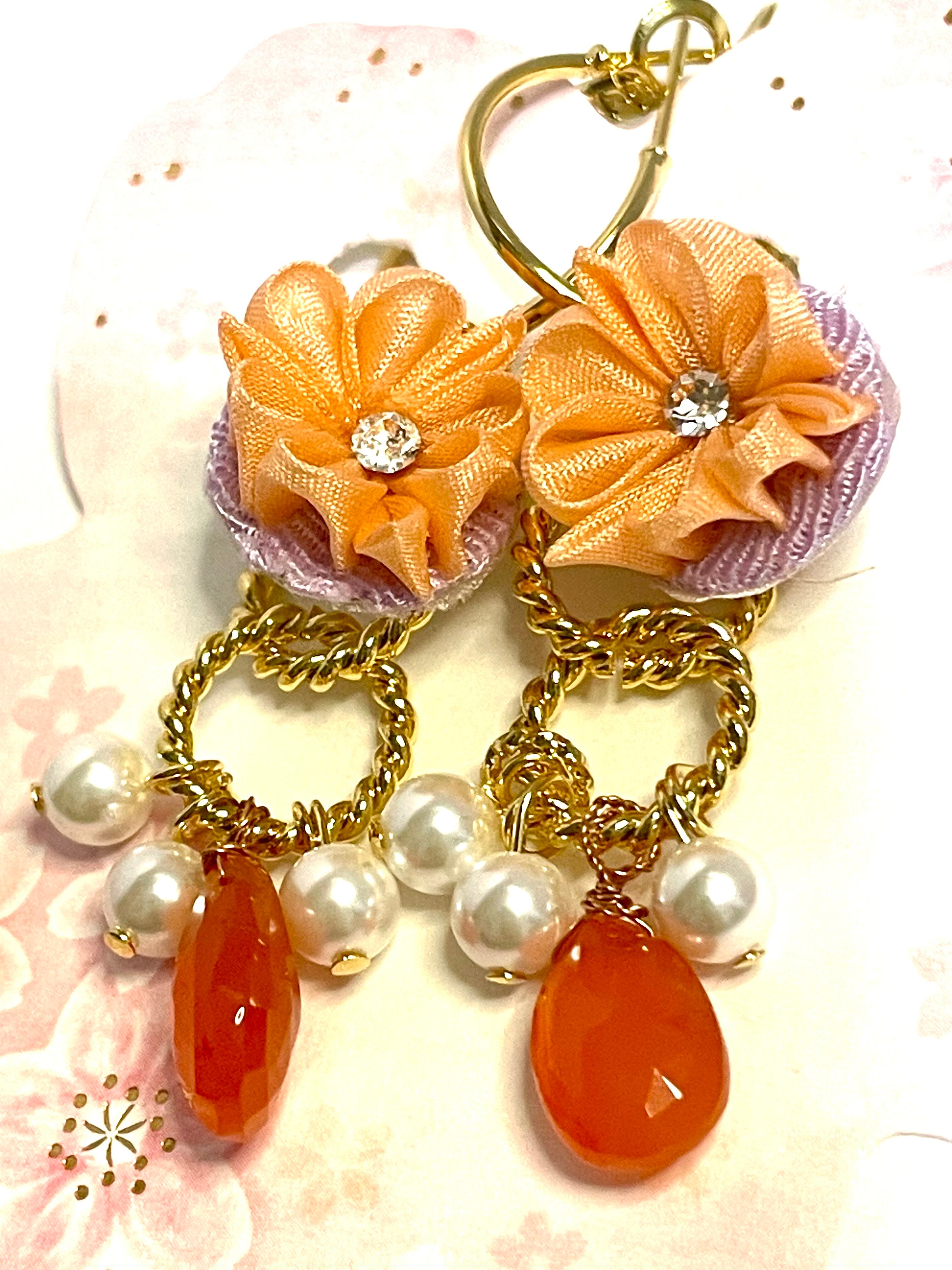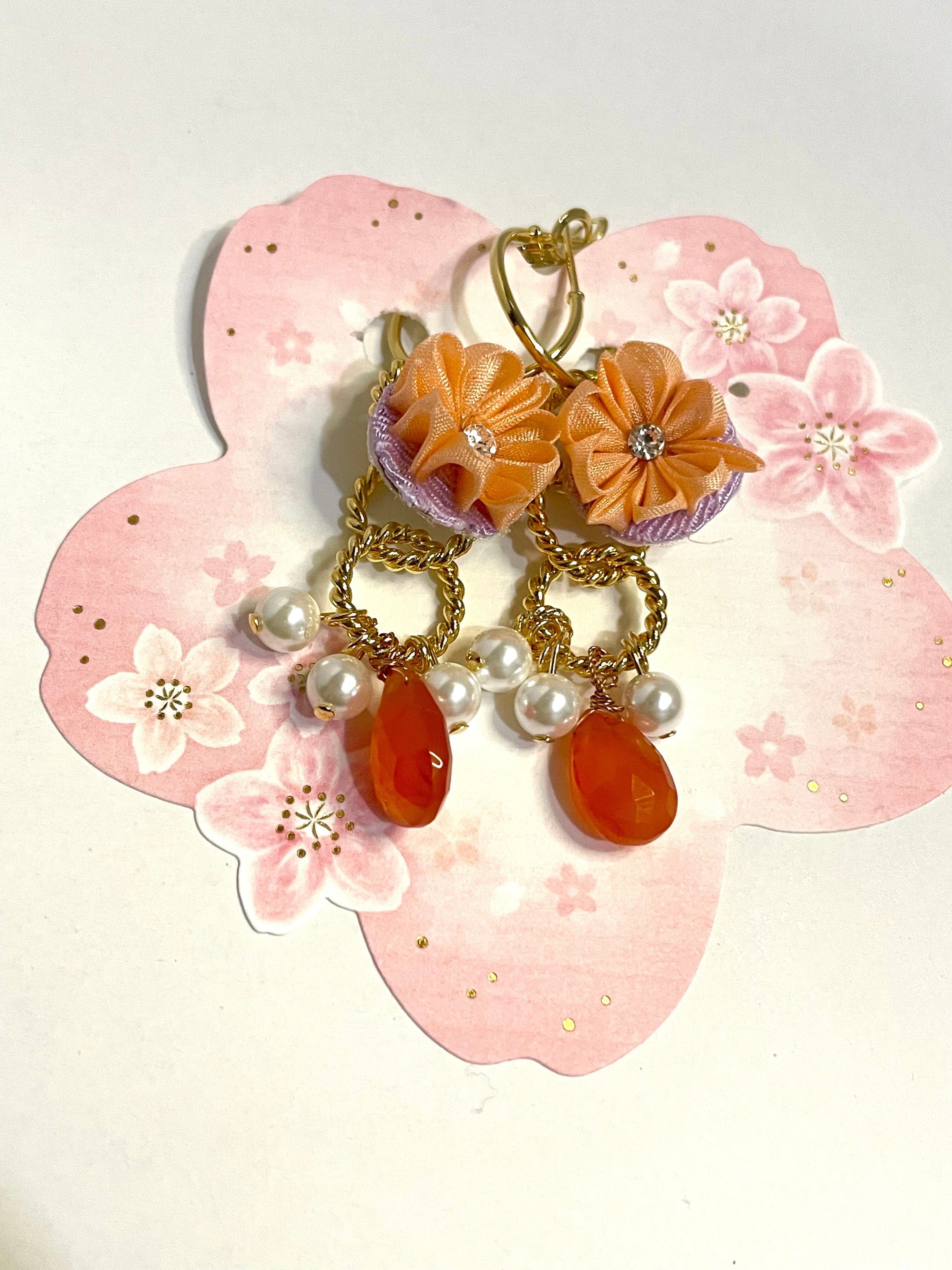 花は10匁シルク使用、淡水パールとカーネリアンという石。キラキラで夏に似合います。