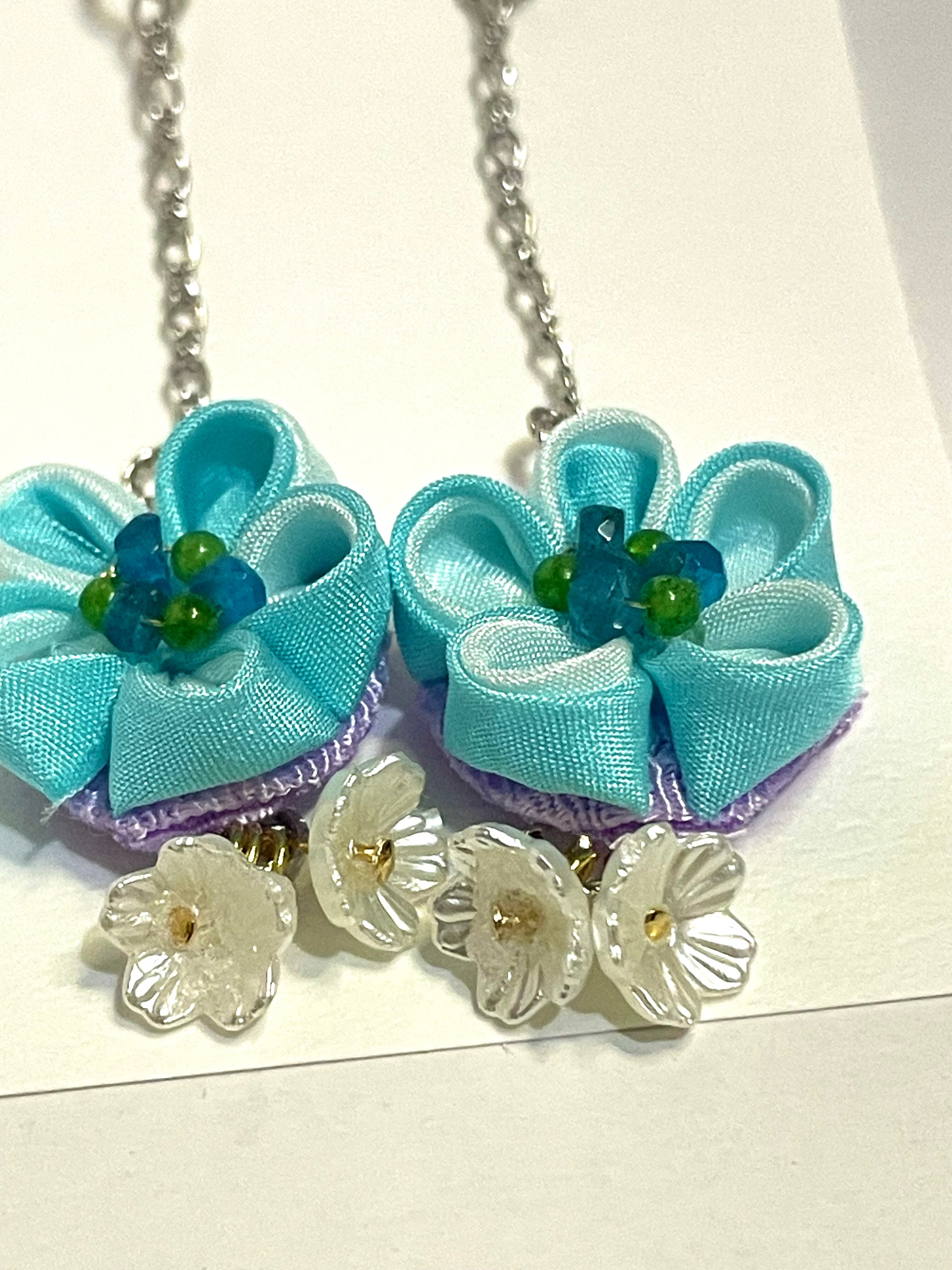 お花はシルク素材、花芯はアパタイトとジェイドを使ってます。今からの季節で使いやすいお色味だと思います。