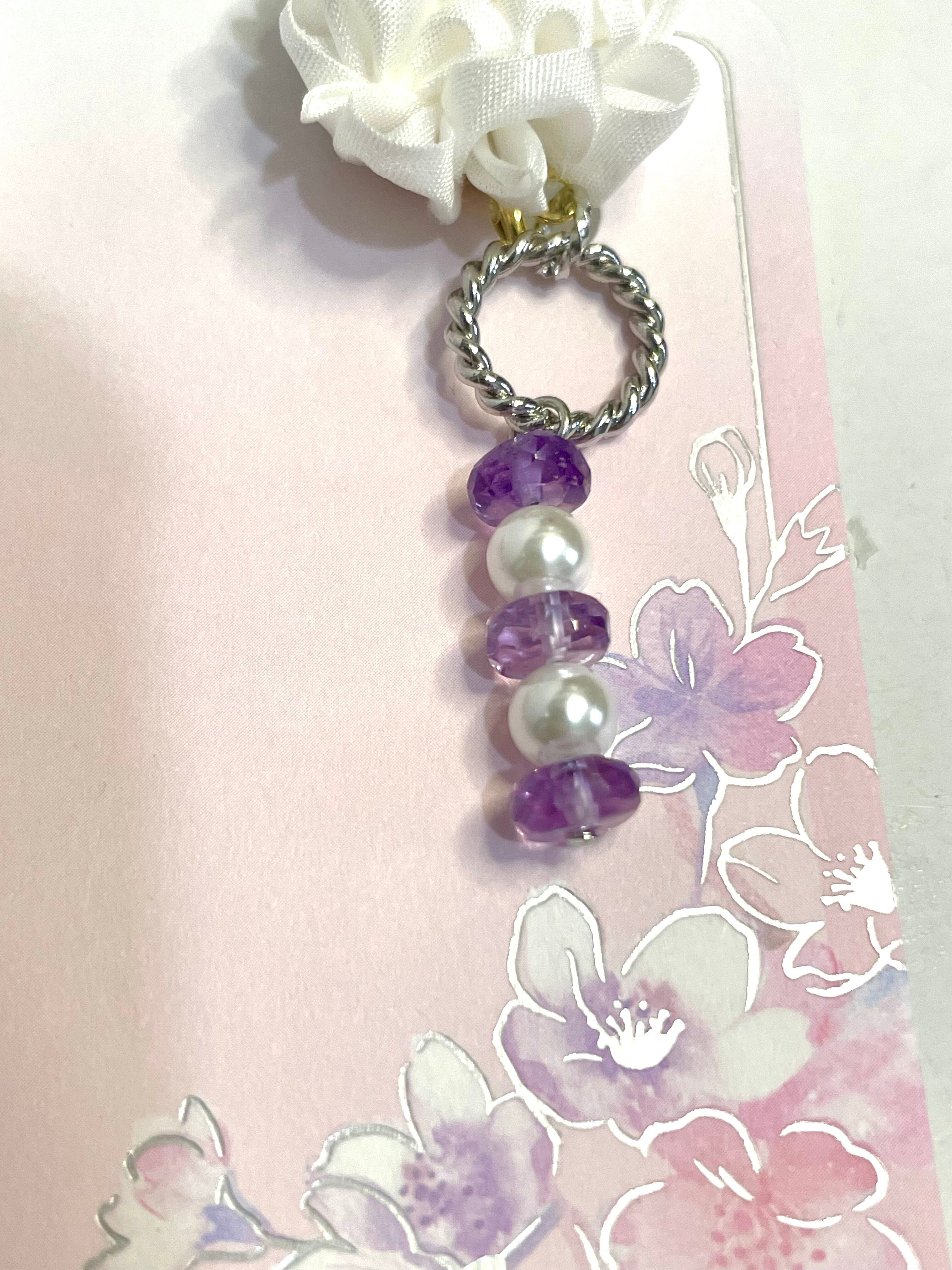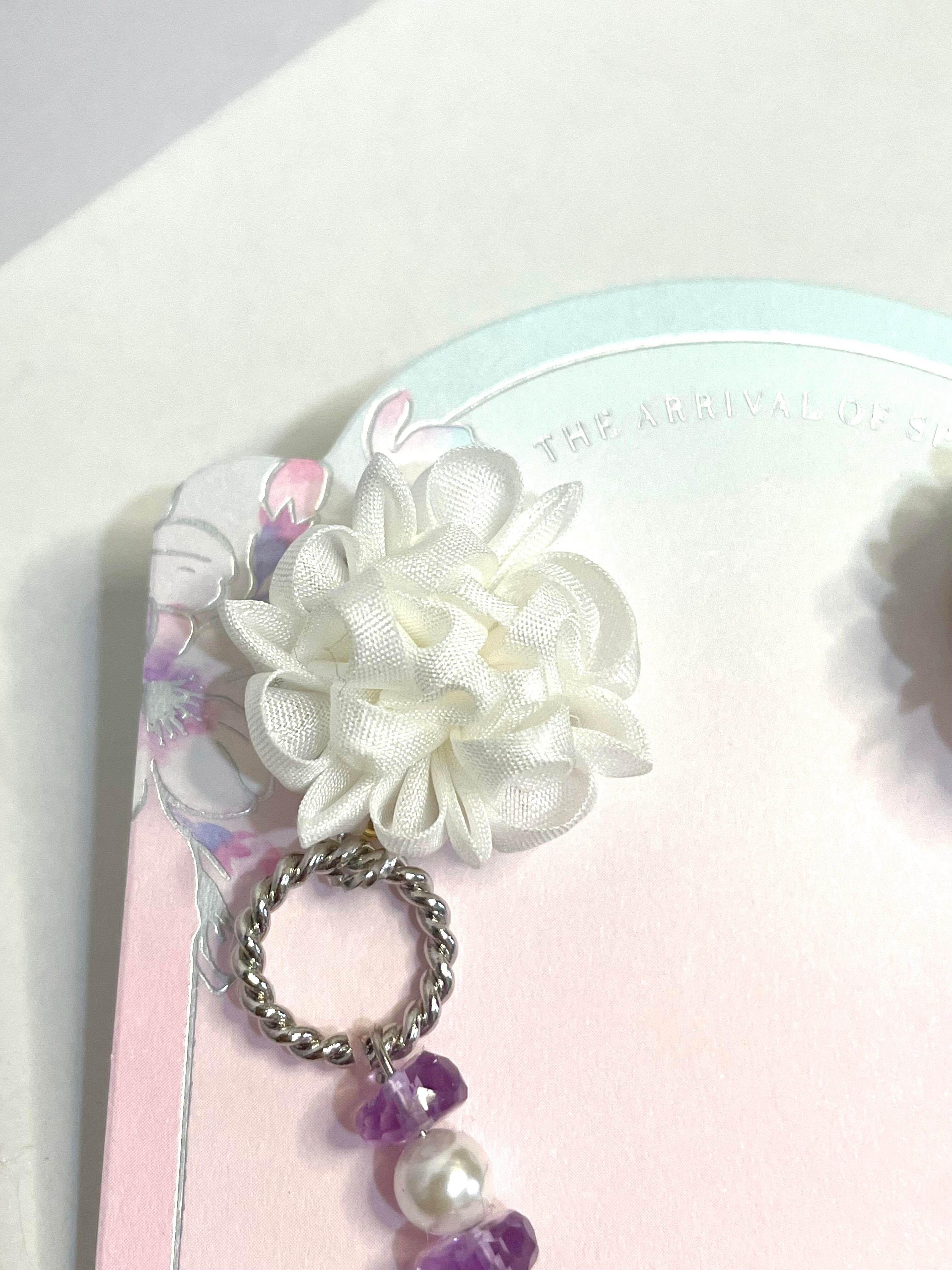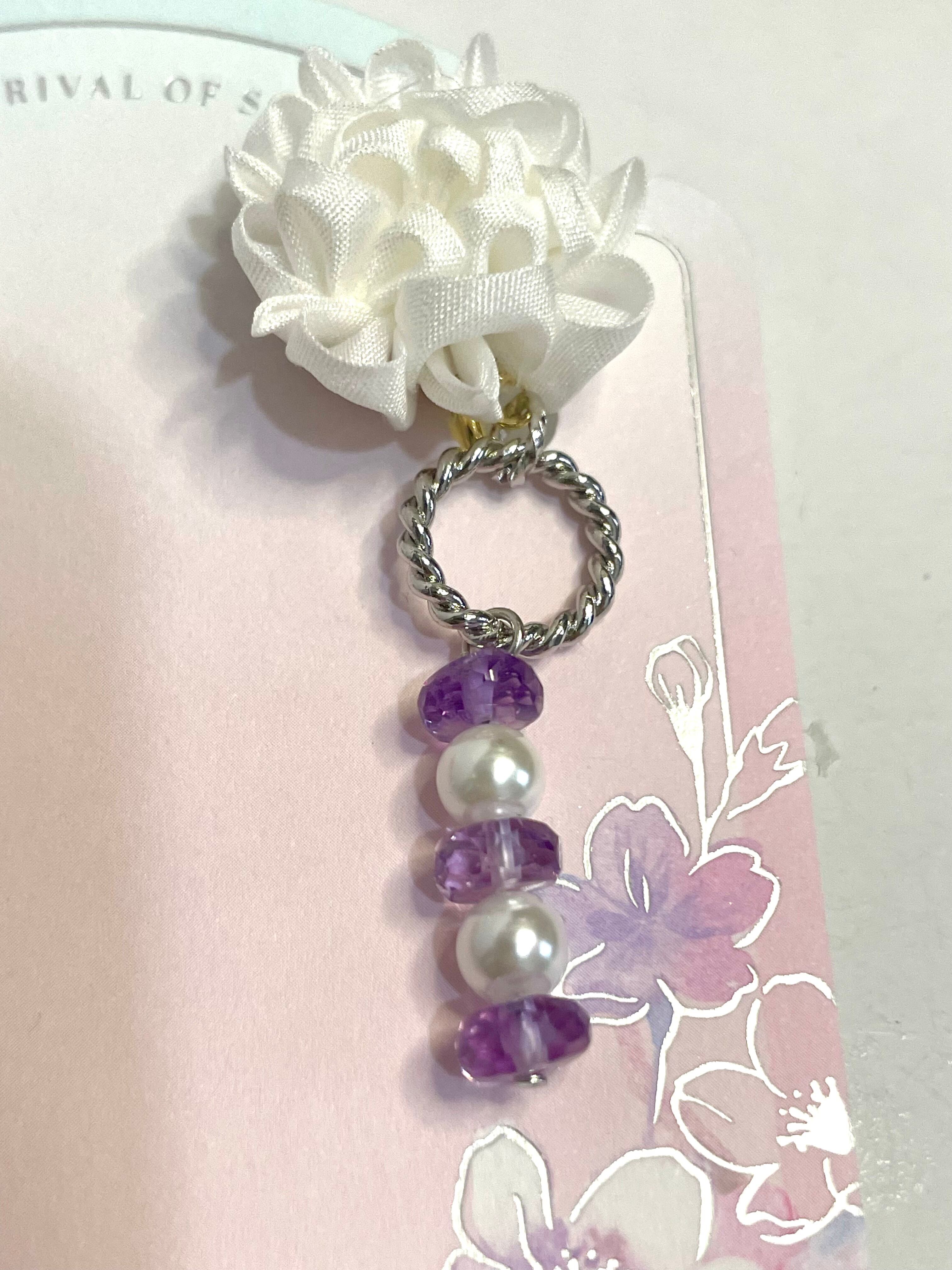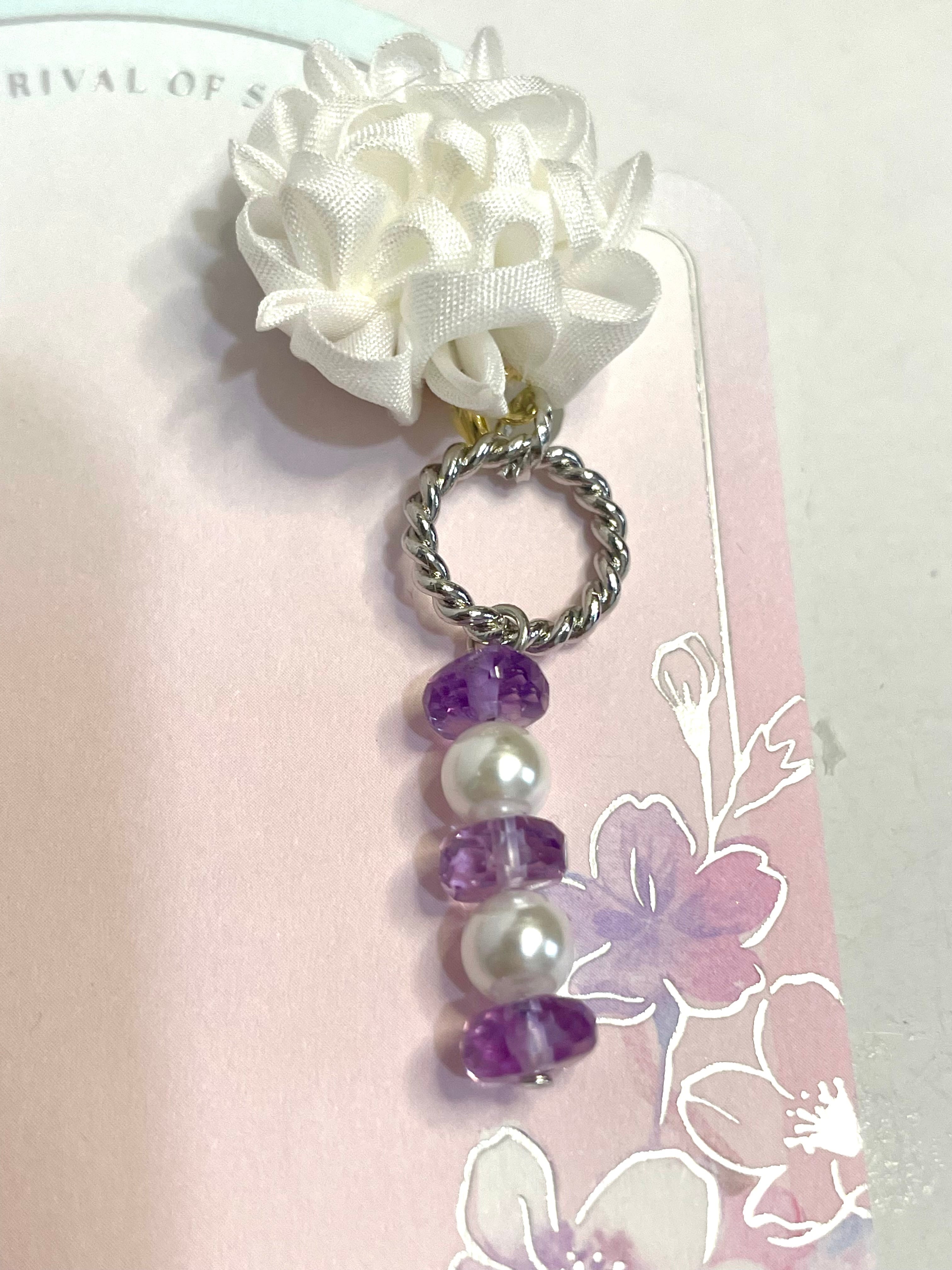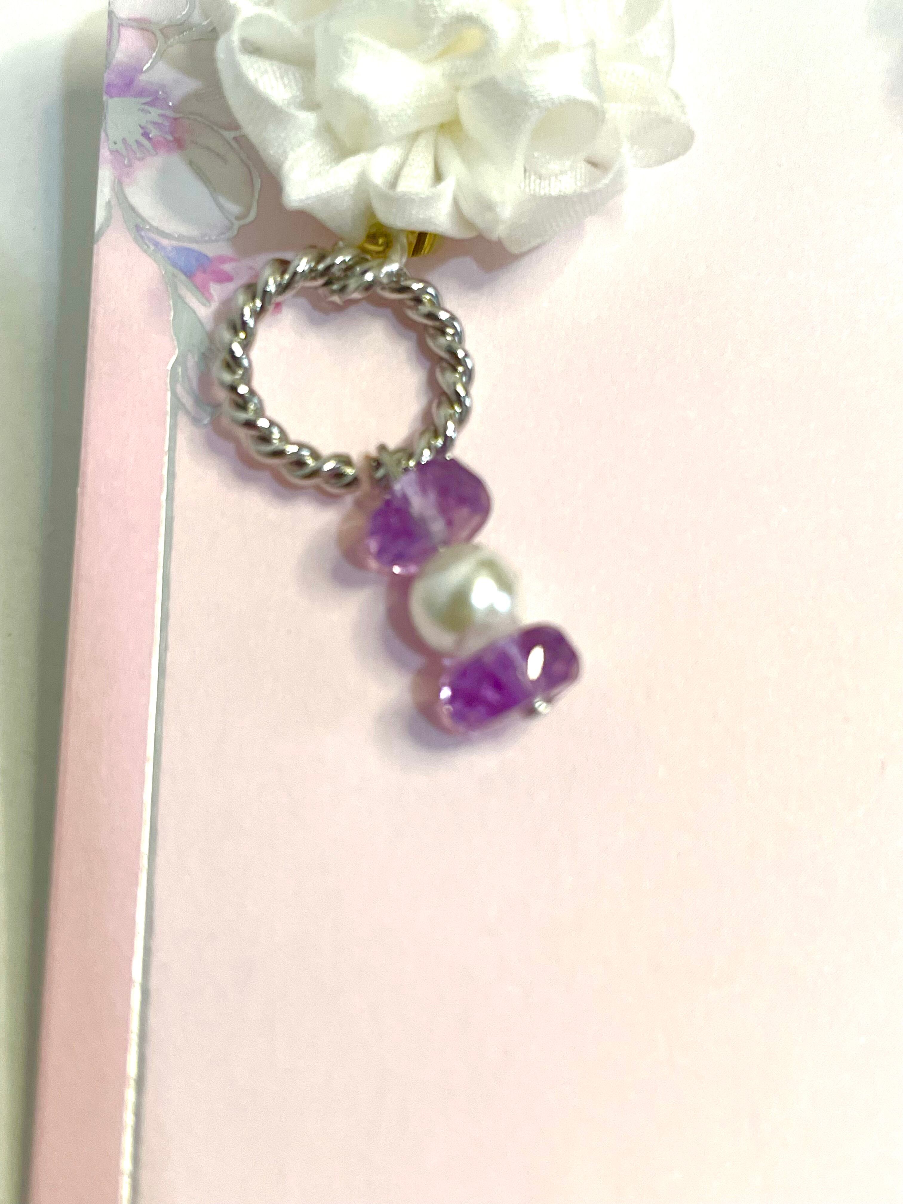 白と紫を基調にしたとてもシックな感じの大人ピアスです。カッチリとした洋服が似合いそう。アシンメトリーで、アメジストとマザーズシェルを使用したイヤリングです。