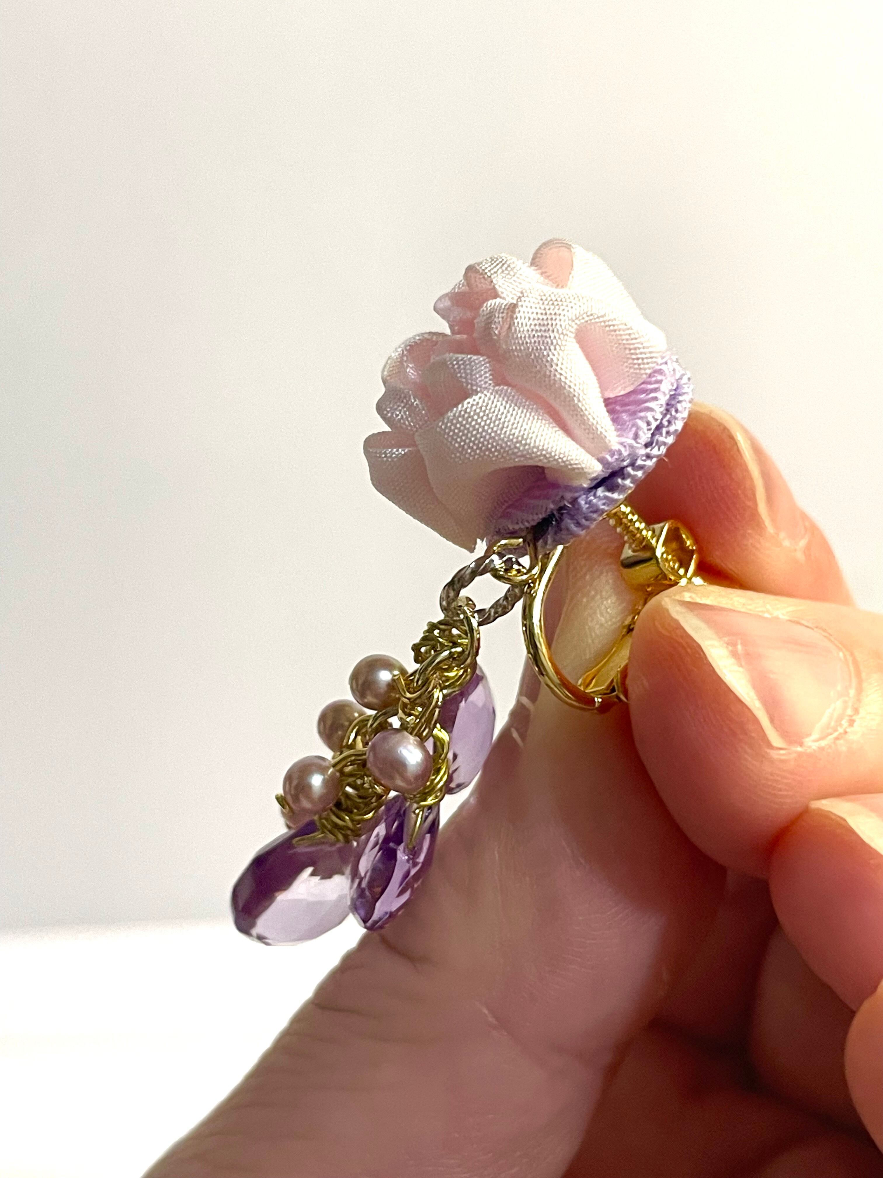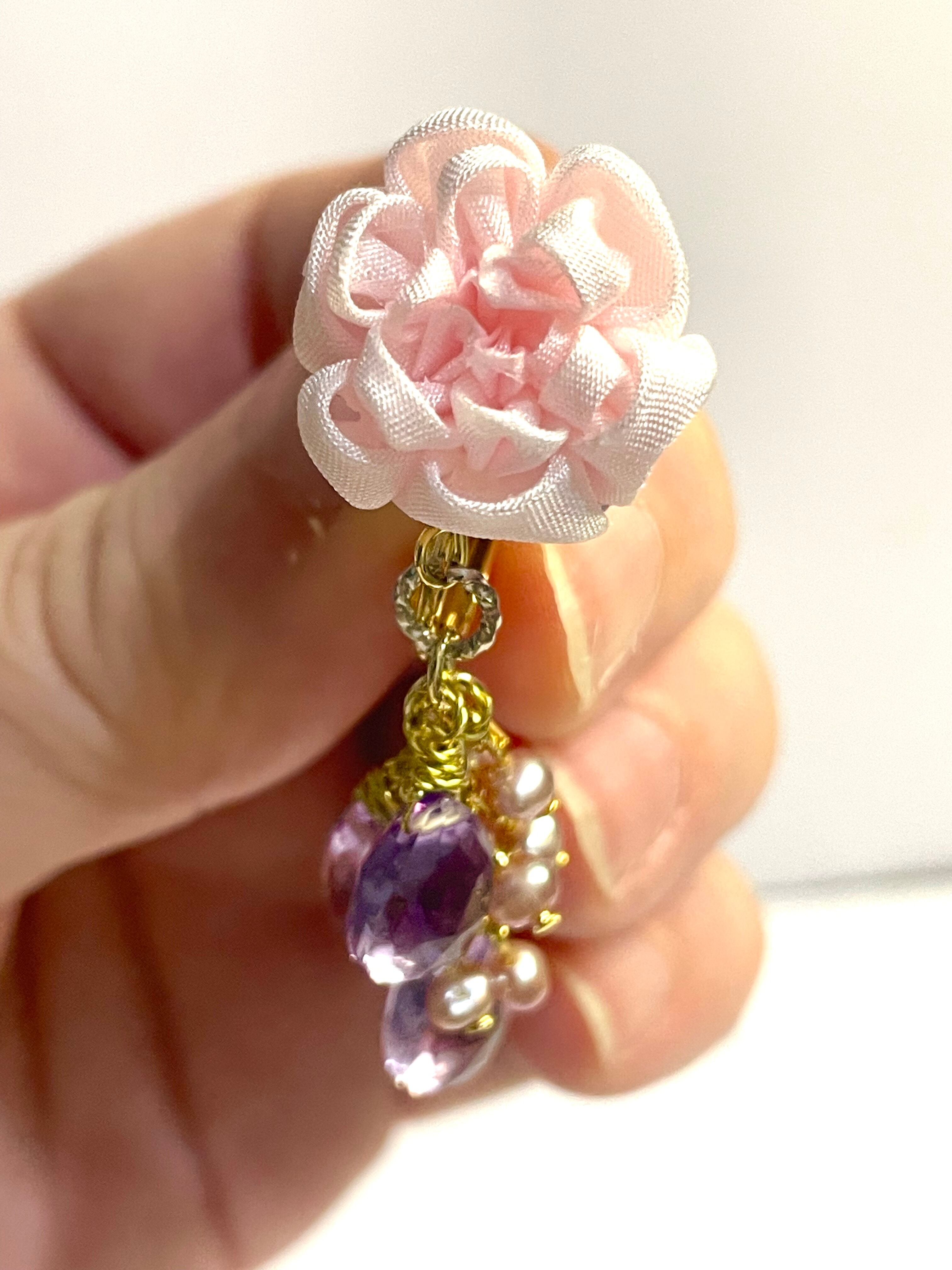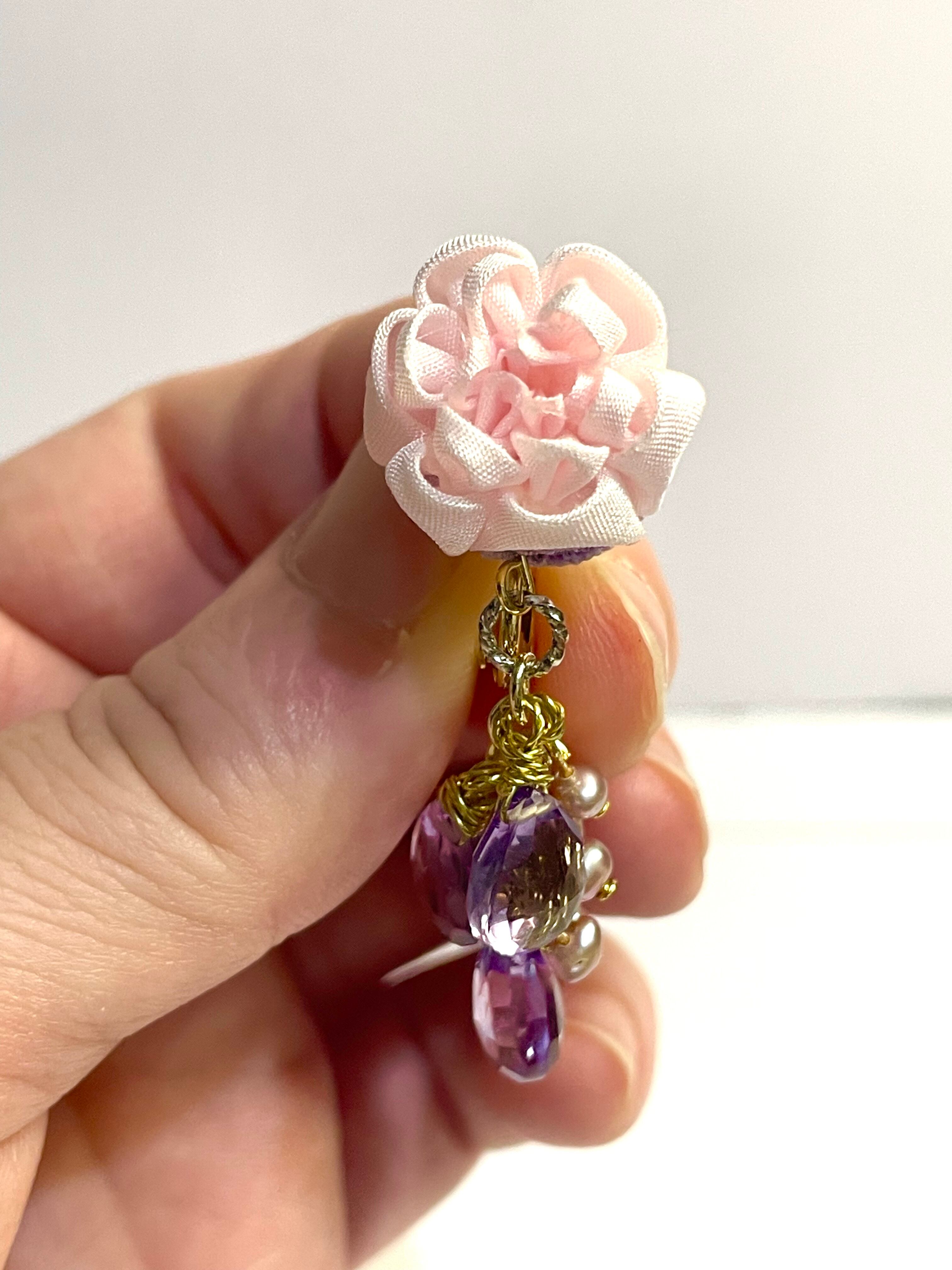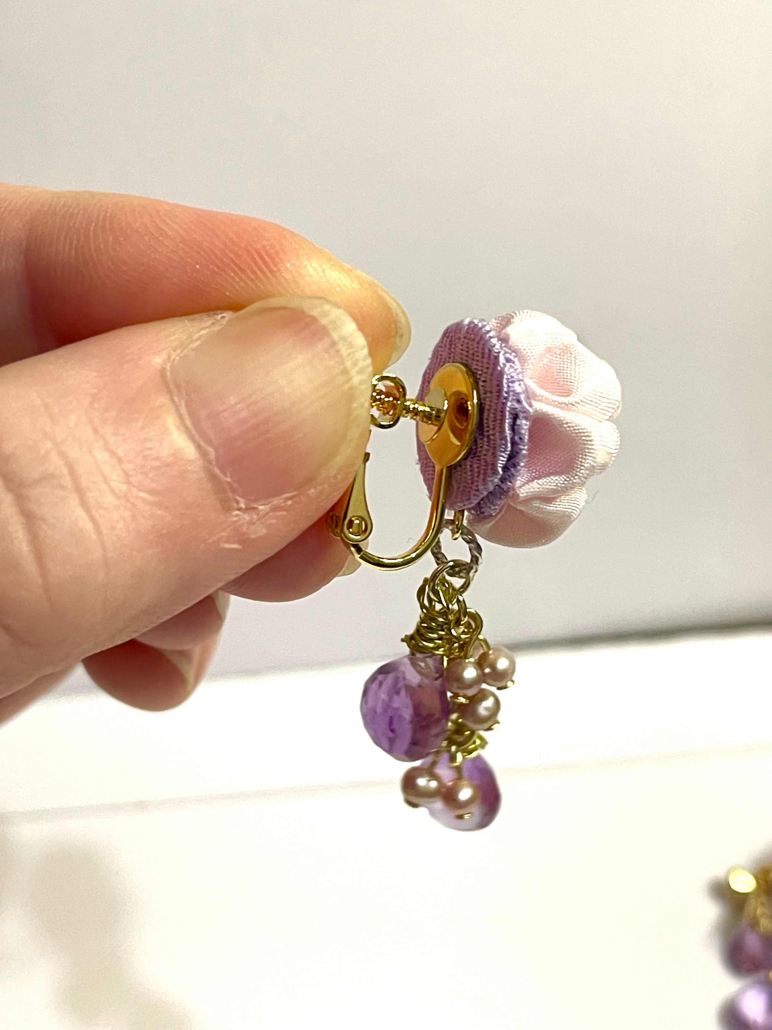 八重桜をイメージして作りました。薄いピンク色のシルク素材を使い、石はピンクアメシストを3石づつ使用、ピンク色の淡水パールも使いました。アメシストの紫色が全体的に甘過ぎない丁度良い感じに纏めてくれています。
